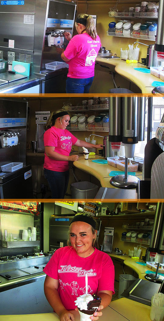 Okay, it’s the third week of our ten week ice cream tour and I’ve had a lot of suggestions and I won’t be able to fit them all into this tour, so I’ll probably do another one next year. One place that was on my list that I have to go to is the M&M Twistee Treat in East Peoria. The shop itself is a giant ice cream cone, so how could I pass that by? Well, the answer is I won’t, so here we go!