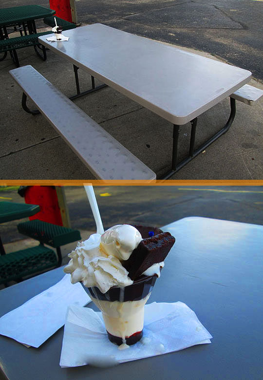 It’s nice outside so I thought we’d eat it at this picnic table over here. We better dig in, it’s starting to melt already!