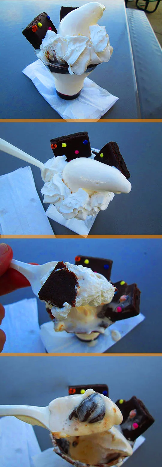 Three and a quarter ice cream cones—The Brownie Delight was really tasty and kind of like two treats in one! The menu here is huge and it’s served up in a giant ice cream cone building!