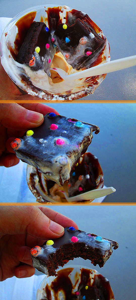 And as you finish off the ice cream, you still have two brownies that are soaked in the ice cream and hot fudge. As good as the ice cream portion was, this is really the best part of it. The brownie is kind of like a super sweet ice cream sandwich! This is really a happy ending to this ice cream creation!