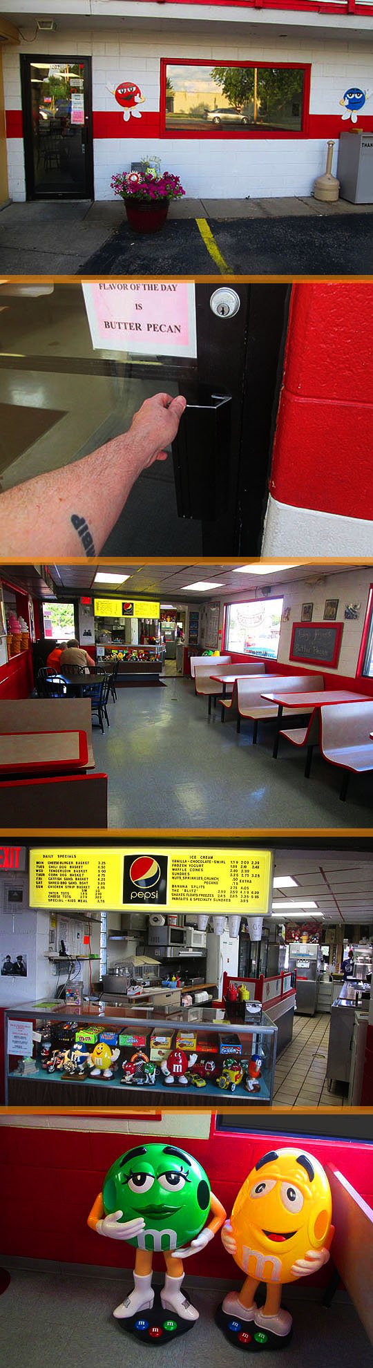 I told you there’s a dining room back here, so let’s go check it out. There’s tables and booths in here and you can order at the front counter. And there’s more than ice cream in here, they have a full food menu including chili cheese dogs, cheeseburgers, hot tamales, bbq sandwiches and lots more. And there’s two M&M’s which the place is named after.