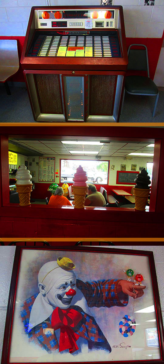 Check out the vintage jukebox back here and there’s a trio of giant ice cream cones in the window over here. Uh, oh...creepy clown sighting over here, nightmare tonight! Thanks to Crystal and Mikayla for a decious ice cream treat and we’ll see you all tomorrow!