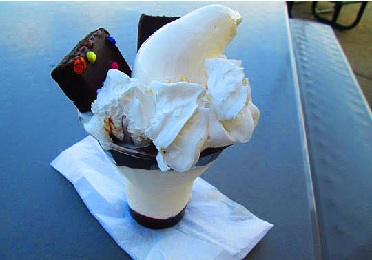 This looks delicious! It’s vanilla soft-serve ice cream with hot fudge in the bottom and topped off with whipped cream and two brownies. It’s really tasty and a sweet summer treat!