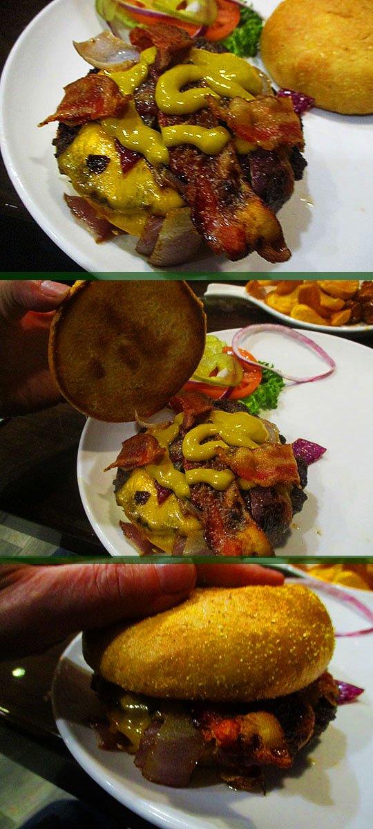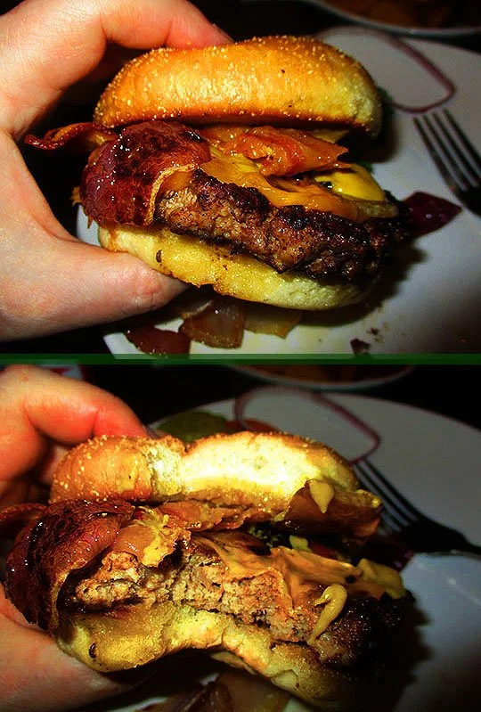 I added a nice dollop of mustard to my bacon cheeseburger and placed the toasted bun on top to take an inaugural bite.