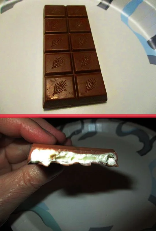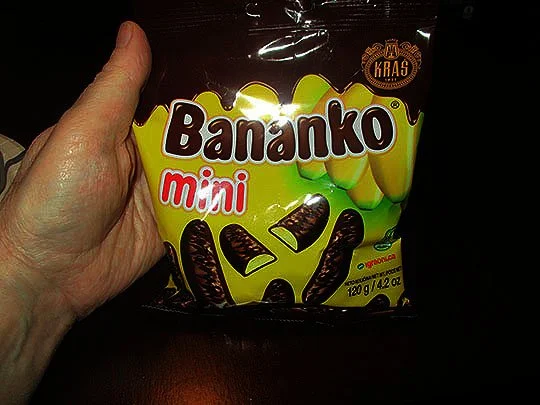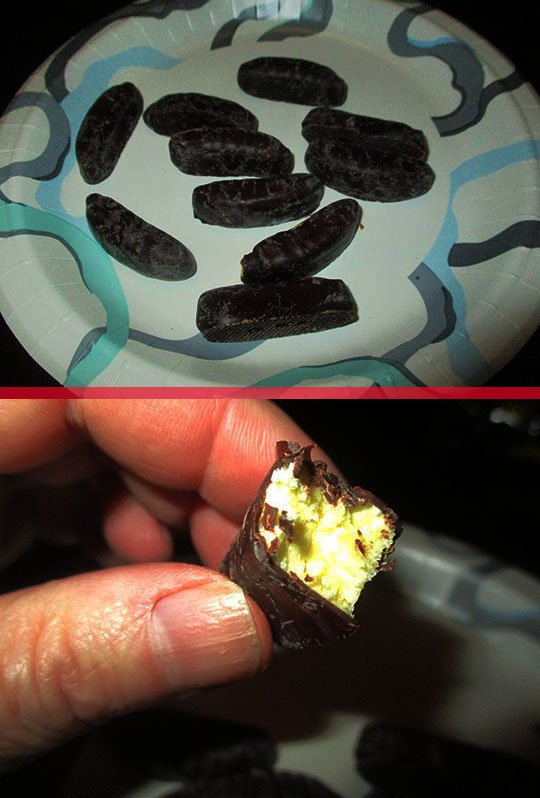 Yep, it’s dark chocolate cylinders filled with a creamy banana filling. A unique and tasty snack item!