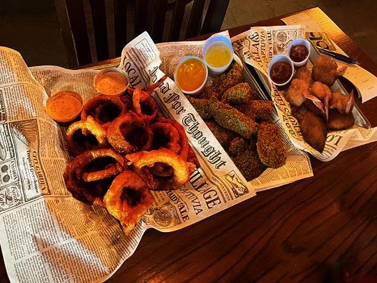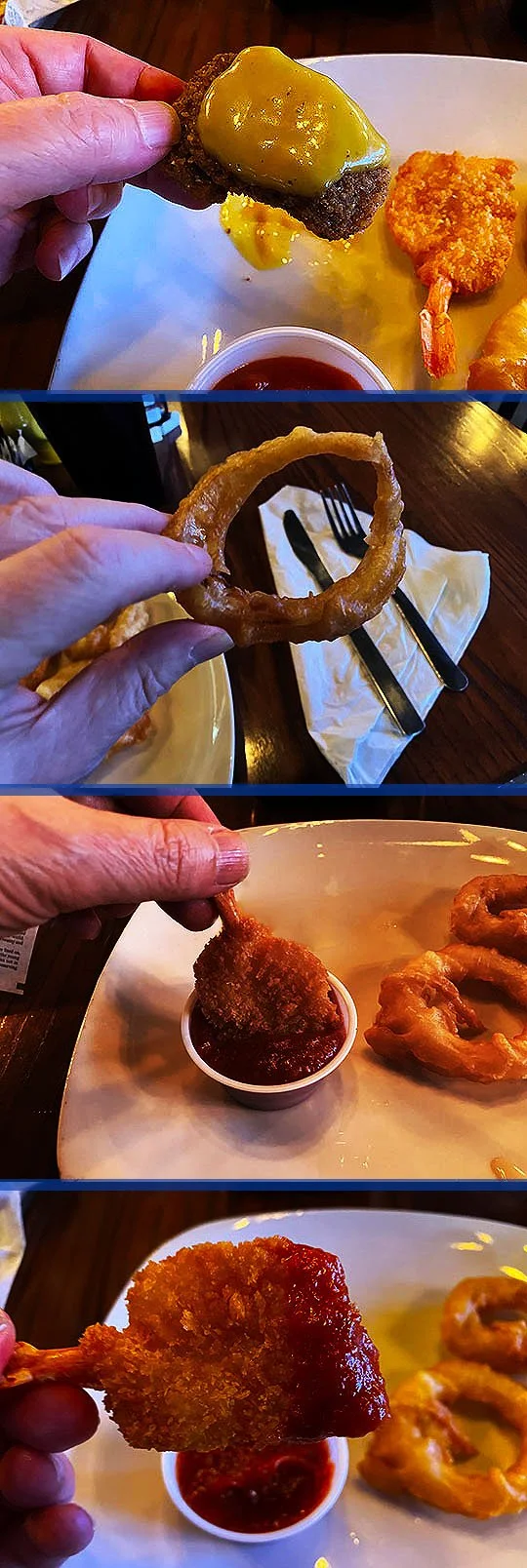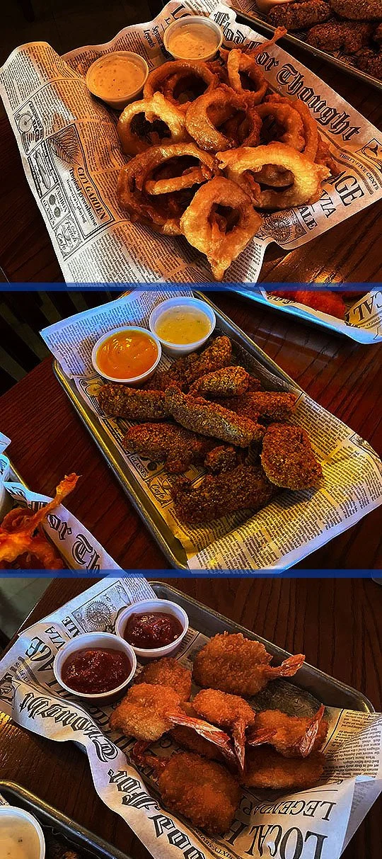 From the top we got: an order of their homemade onion rings, the Mushroom Fries and an order of the Ale Battered Shrimp.