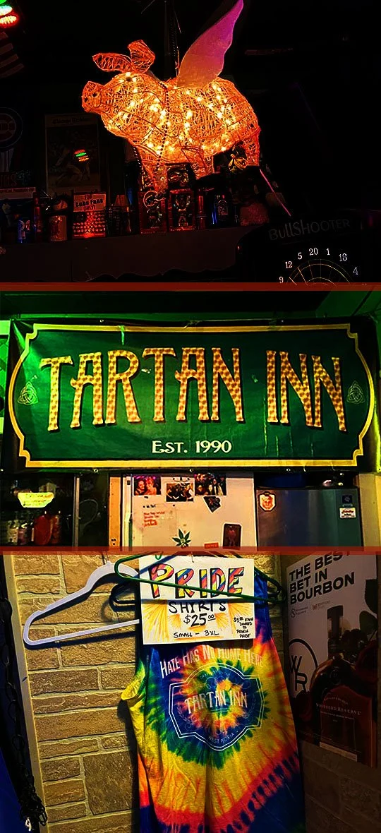 There’s a sparkly flying pig up near the ceiling, a Tartan Inn sign and Pride t-shirts for sale.