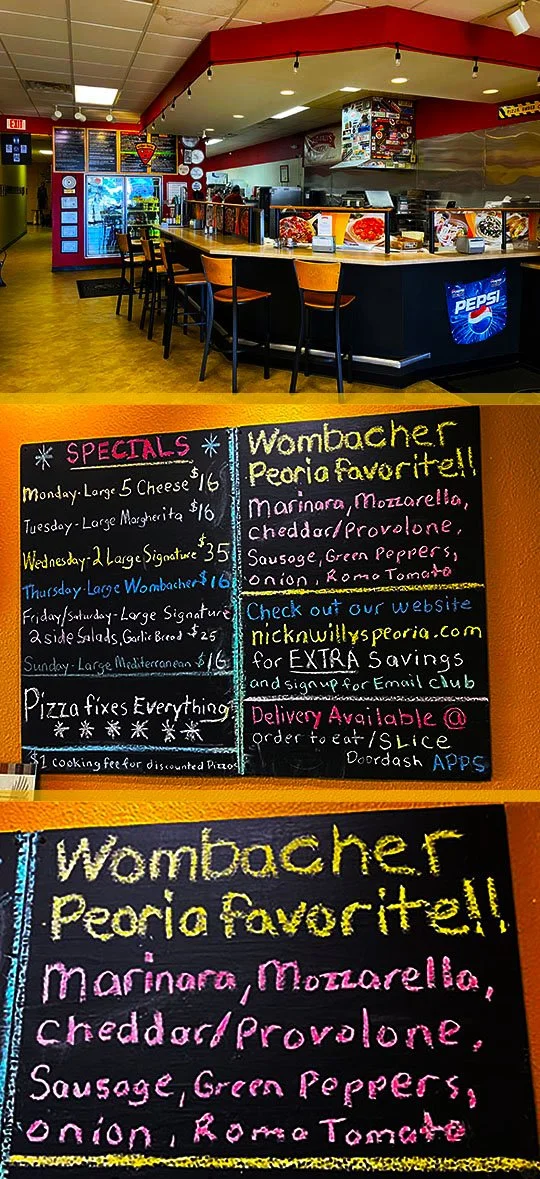 There’s the Wombacher Pizza which is a spectacular, one-of-a-kind tasty pizza, only available at Nick-N-Willy’s, it’s kind of like eating this blog, but a lot tastier!