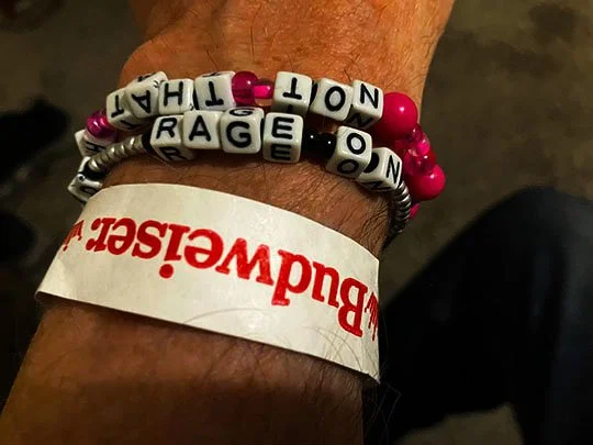 Check out the two bracelets given to me by a nice woman in the crowd. She didn’t want her picture taken, but told me her children made these for her to pass out to people in the crowd.