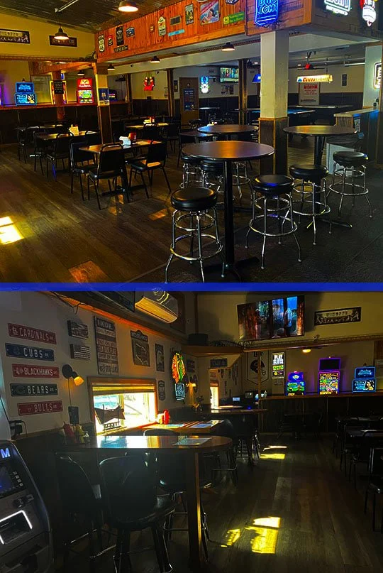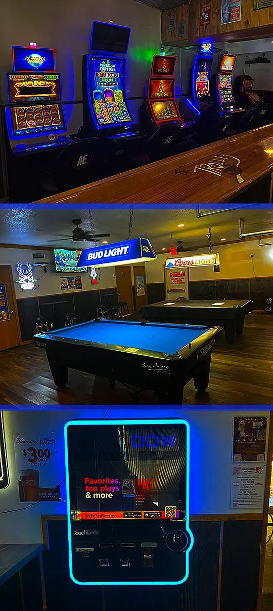 There’s gaming machines lining the back wall, two pool tables in the side room and a state of the art jukebox on the wall over here.