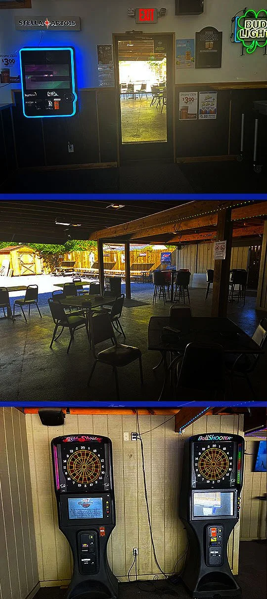 There’s a spacious outside patio with tables and chairs and two dart boards. They have live music shows out here occasionally.