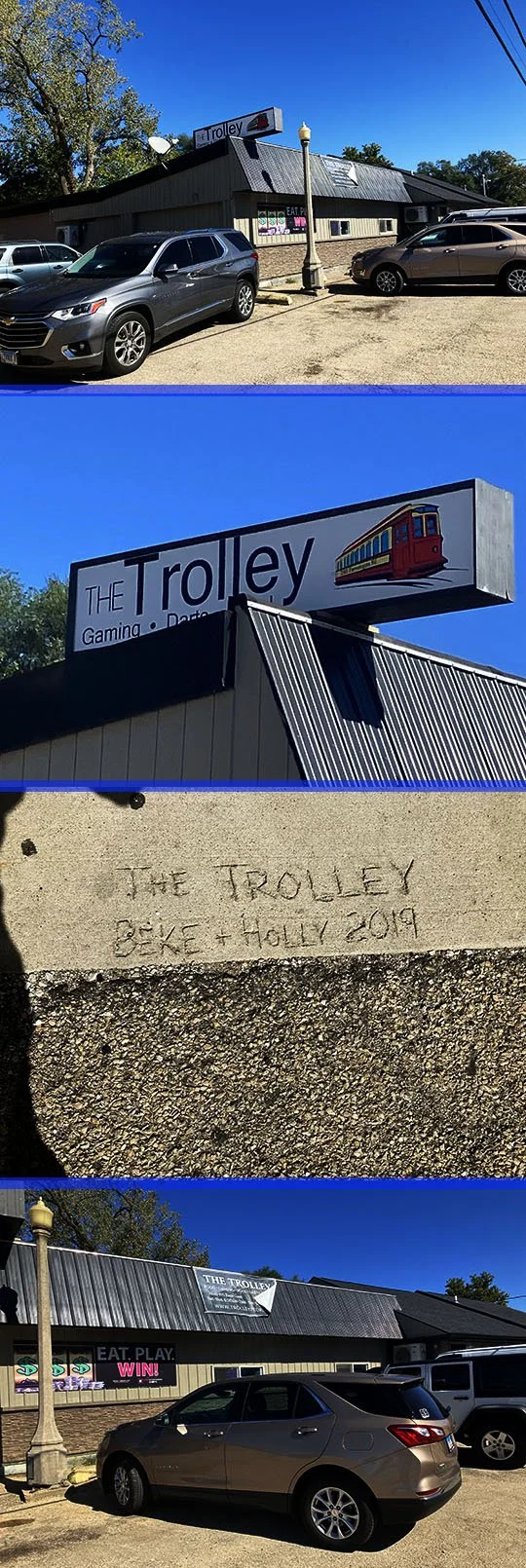 Here we are at The Trolley on Farmington Road. This place has been here forever, but the new owners, Beke and Holly took it over in 2016 and there’s their names in concrete back in 2019!