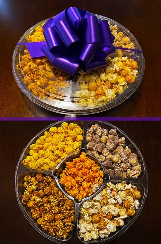 Minutes later, there’s Greg with the popcorn sampler all dressed up with a nice purple anniversary bow! It looks fantastic and now we’ll head on back to MBIP World Headquarters for a popcorn snacking session!
