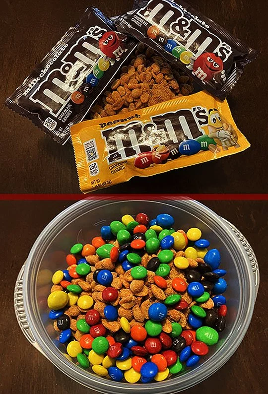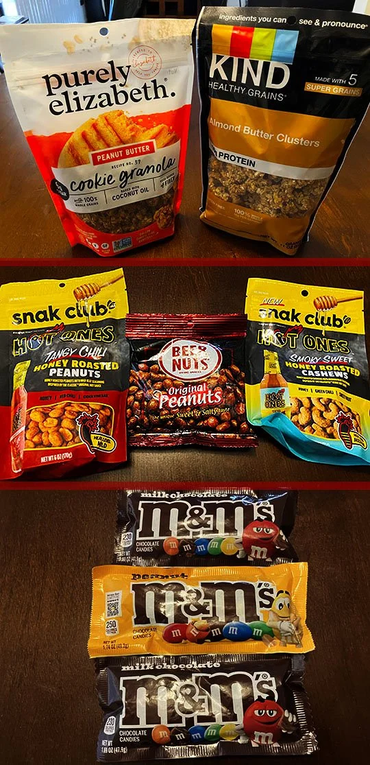From the top: Purely Elizabeth and Kind granola treats, Hot Ones and Beer Nuts peanuts and plain and peanut M&M’s.