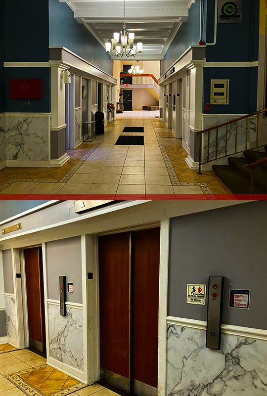 Here we are and there’s Greg and Dan on the elevator! And there’s the legendary Greg’s Big Black Couch!