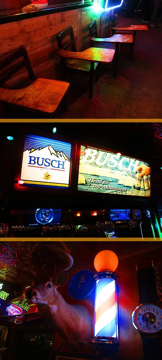 There’s the legendary desks opposte the bar at Mike’s, The classic Busch sign and oh deer, check out the barber pole!