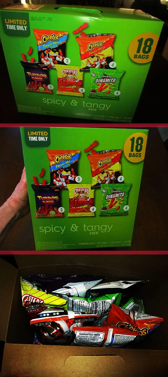 I just closed my eyes and picked a box from the wall of snacks at Hy-Vee. I ended up with a Spicy and Tangy Mix.