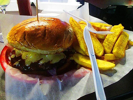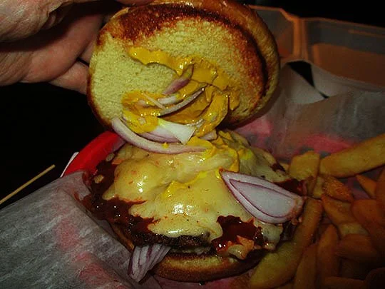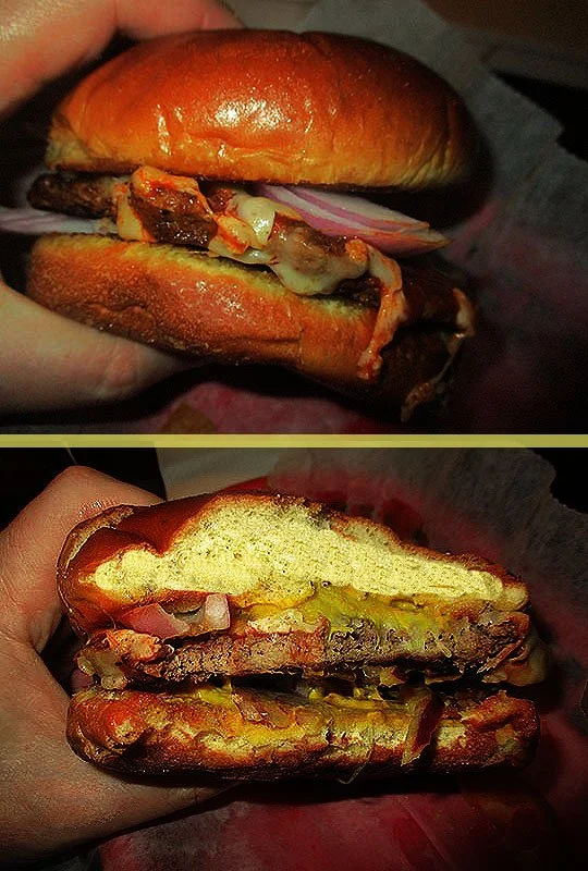 I got the Buffalo Burger, which is a burger topped with pepperjack cheese, blue cheese and buffalo sauce. I also got mustard and onions as extra toppings.