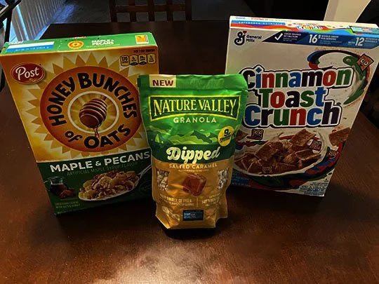 Here’s the trio of cereals I chose, clockwise from left: Honey Bunches of Oats, Cinnamon Toast Crunch and a bag of Nature Valley Granola.