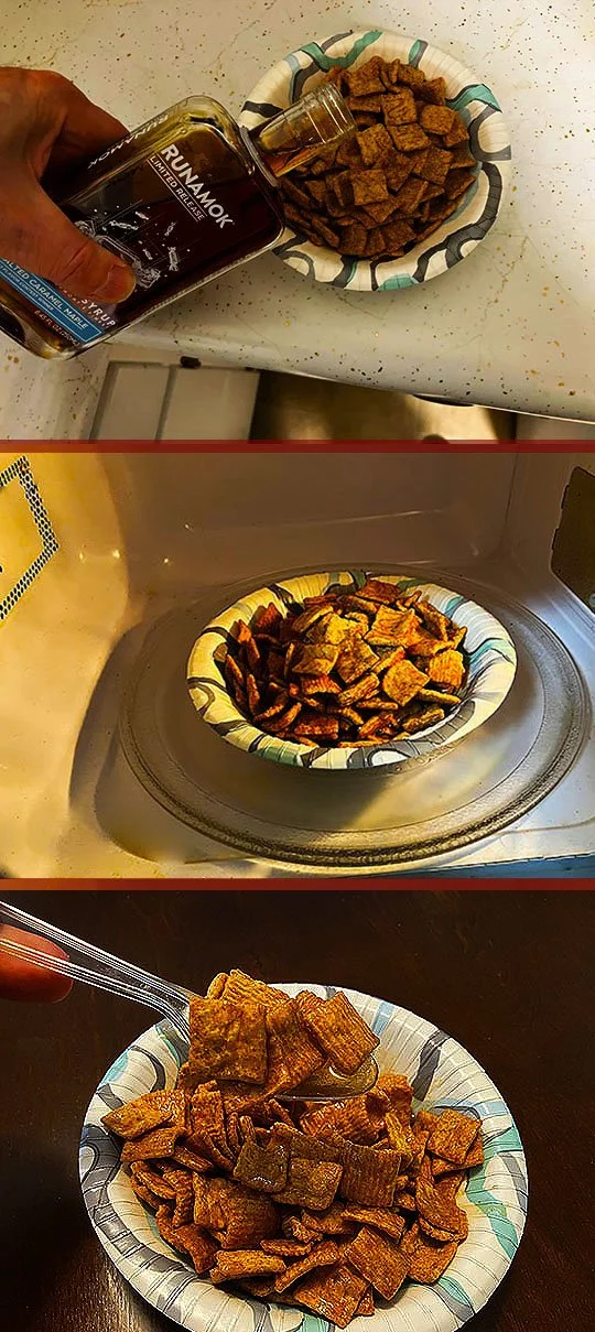 Well, actually they’re spelled cereal snacks and yes, they are snacks derived from boxes and bags of cereal. Most people have cereal for breakfast and cover it with milk. Well, if you take the milk out of the equation, it magically becomes a dry snack item. And if you add another ingredient and microwave the cereal…well, that might just take that item into cereal snack heaven!