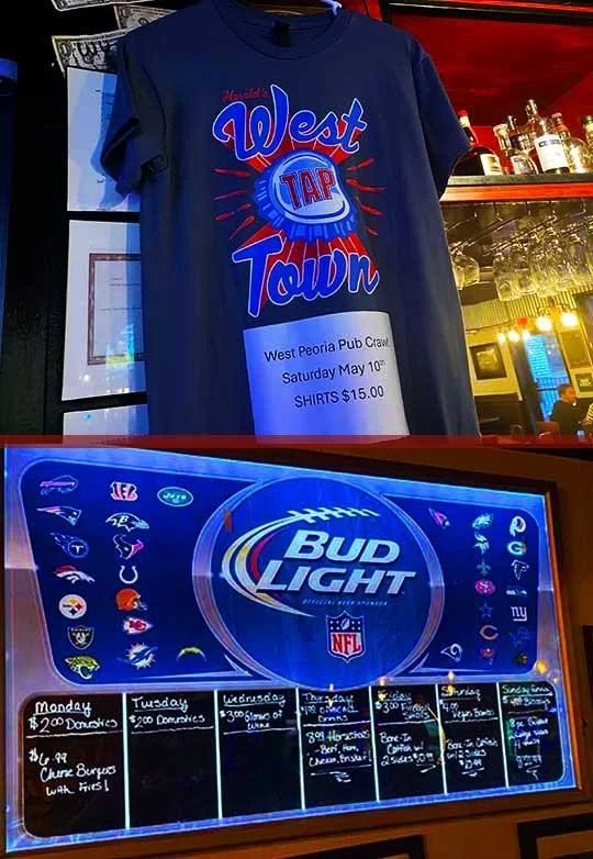 They still have a few t-shirts left from the West Peoria Pub Crawl that happened last May and there’s the scorecard featuring the daily specials in here.