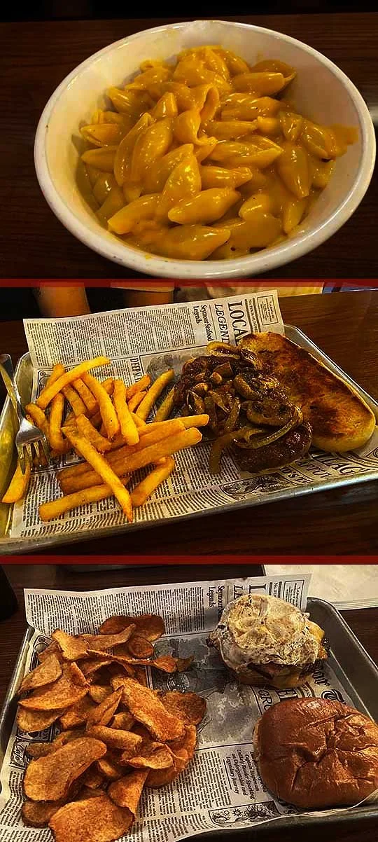 From the top, Amber got the Adult Mac and Cheese, Joe got the Ribeye Sandwich with mushrooms and onions and I got the Ole Clucky Cheeseburger.