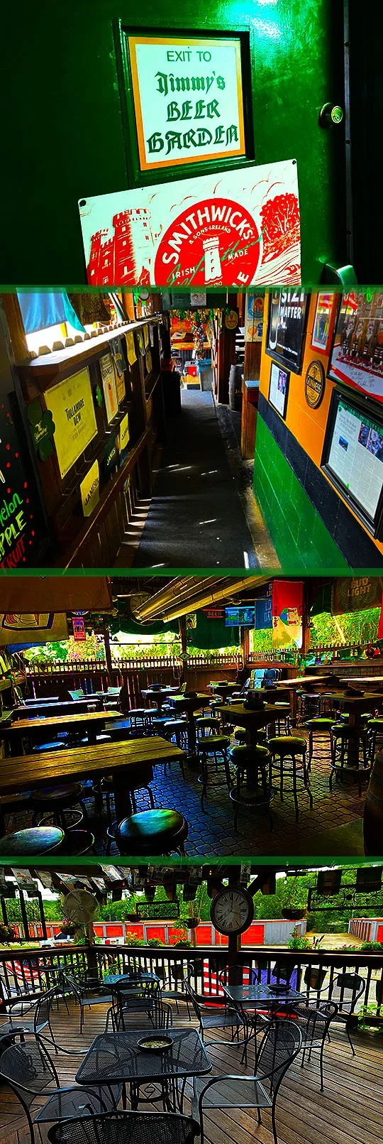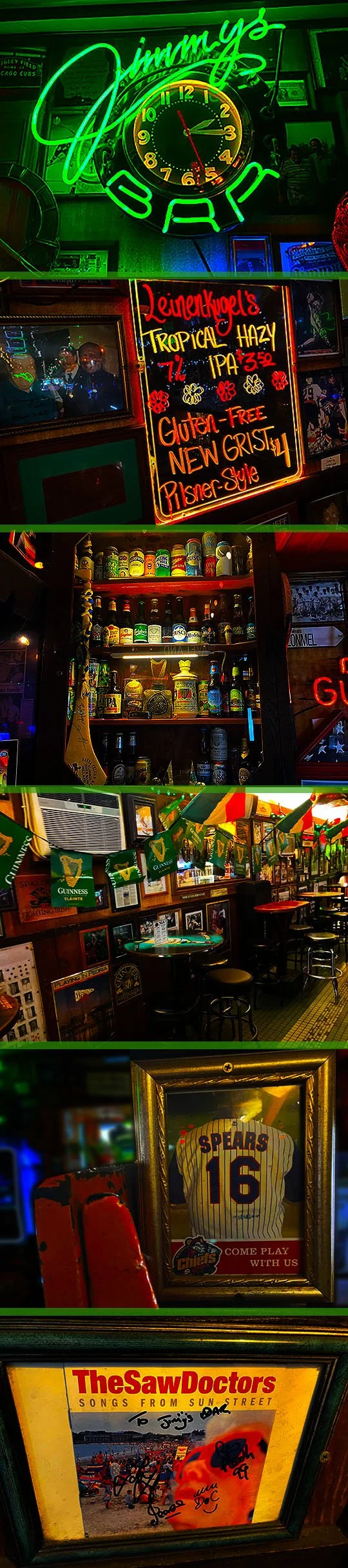 I love the Jimmy’s clock on the wall, there’s the beer can and bottle collection next to the bar and the walls are covered in fun pictures and various memorabilia like the Spears jersey and I love the Saw Doctors photo because I met them in New York City years ago and we talked about Jimmy’s bar when I met them!