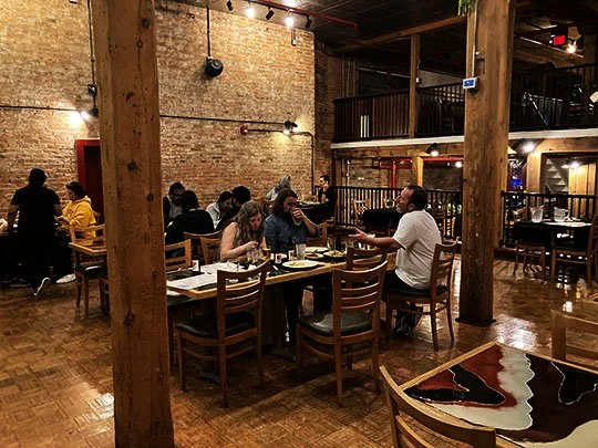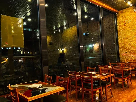 Tables line the front floor to ceiling window of the dining room which has a nice view of Washington Street in downtown Peoria.