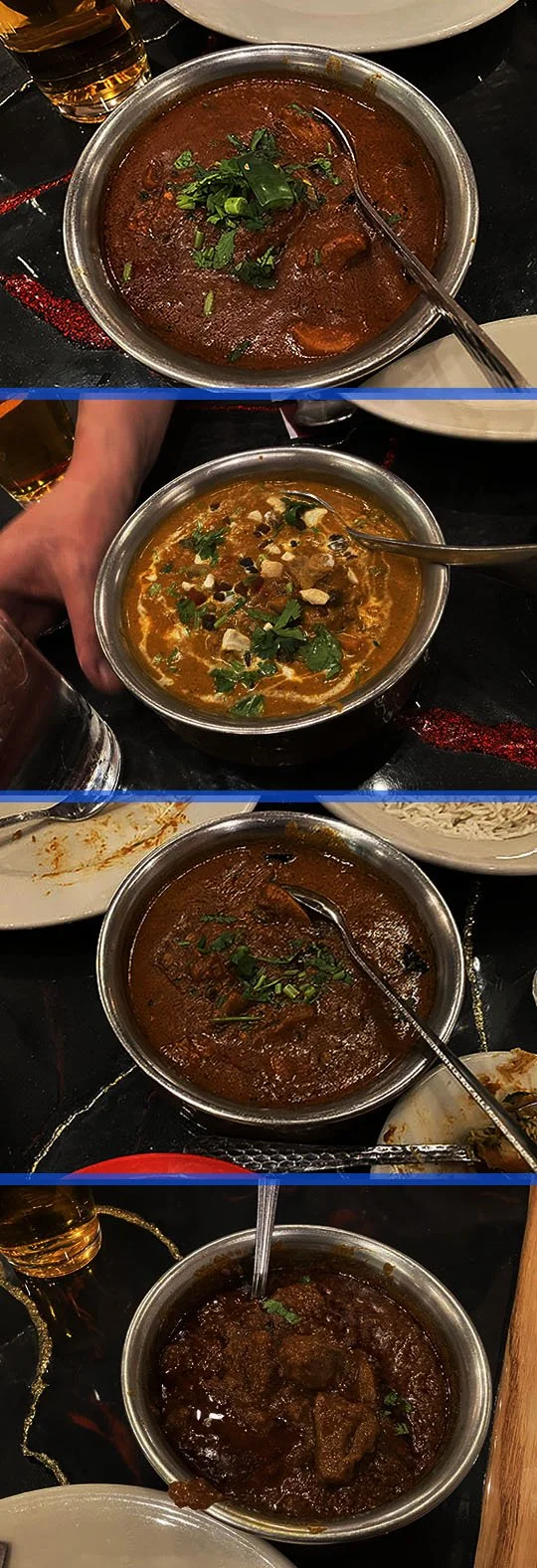 Our main courses have arrived and they are: Chicken Chettinad, Lamb Rogan Josh, Navratan Korma and Andrah Chicken Curry.